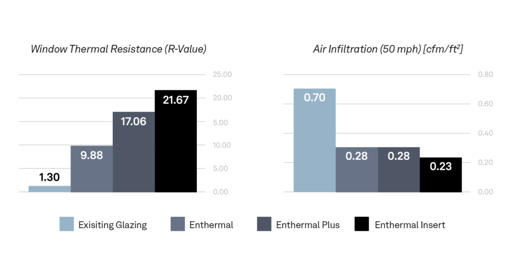 The result is a dramatic improvement in the windows’ thermal resistance, reducing heat loss in winter and heat gain in summer – key factors in lowering energy costs and improving tenant comfort. By retaining existing window frames, capital cost is reduced by up to 60%, tenant displacement is minimized, and costly full-scale facade renovations can be avoided.