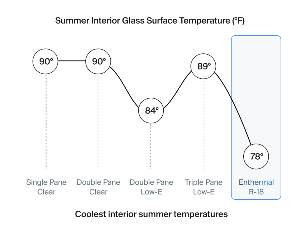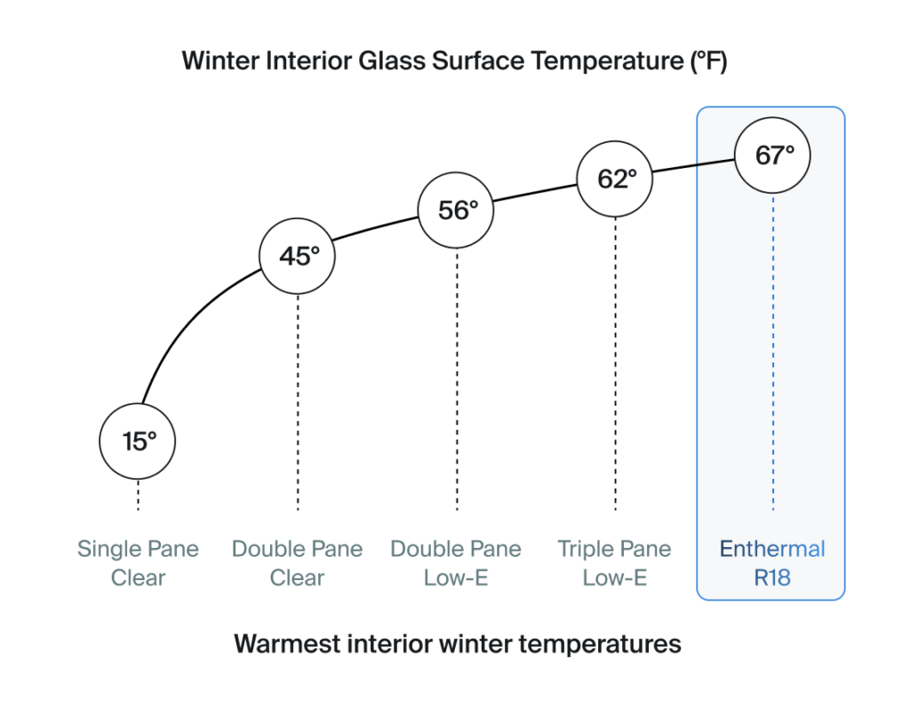 Enthermal™ R-18 Transparent Insulation delivers the warmest interior surface temperatures, preventing cold drafts and discomfort near windows, even in freezing conditions.