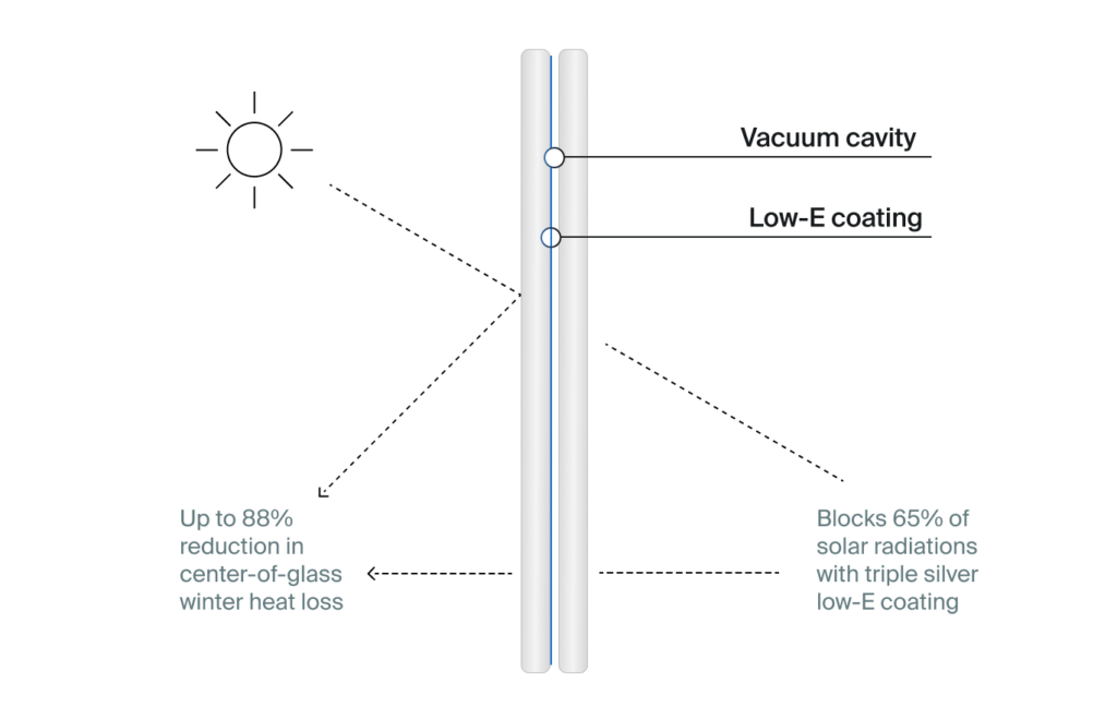 A high performance glazing solution that uses a vacuum gap between glass panes to minimize heat transfer, delivering exceptional energy efficiency, noise reduction, and comfort.